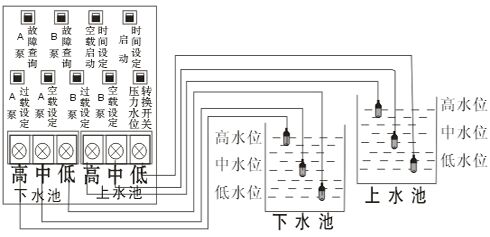 下水池用訊號線需跟廠家另行訂購,不能設(shè)置空載(即空載為000)。上水池的水用到中水位時會開始抽水,抽到高水位會水滿停機(jī)。下水池滿至高水位時會開始抽水,抽到中水位時會停機(jī),即缺水保護(hù)。上、下水池之低水位訊號線都是起回路作用。