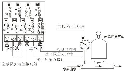 b、上水池高、中、低控制線與電接點(diǎn)壓力表指針接駁 應(yīng)是