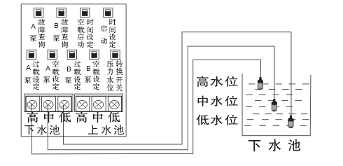 設(shè)置空載保護(hù)后,下水池不能接探頭。上水池的水用到中水位時會開始抽水,抽到高水位會水滿停機(jī),低水位訊號線起回路作用。