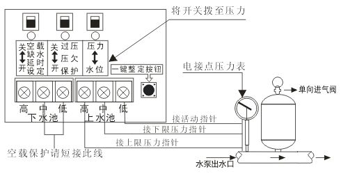 7、壓力接法:將控制器“壓力/水池”選擇開關(guān)(在訊號線接線端子上端)撥到“壓力”檔,然后將上水池訊號線高中低水位與電接點壓力表高中低壓力位對接。
