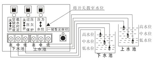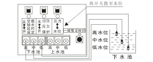 下水池用訊號線需跟廠家另行訂購,不能設(shè)置空載(即空載為000)。上水池的水用到中水位時會開始抽水,抽到高水位會水滿停機。下水池滿至高水位時會開始抽水,抽到中水位時會停機,即缺水保護。上、下水池之低水位訊號線都是起回路作用。