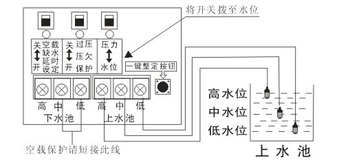 設(shè)置空載保護后,下水池不能接探頭。上水池的水用到中水位時會開始抽水,抽到高水位會水滿停機,低水位訊號線起回路作用。
